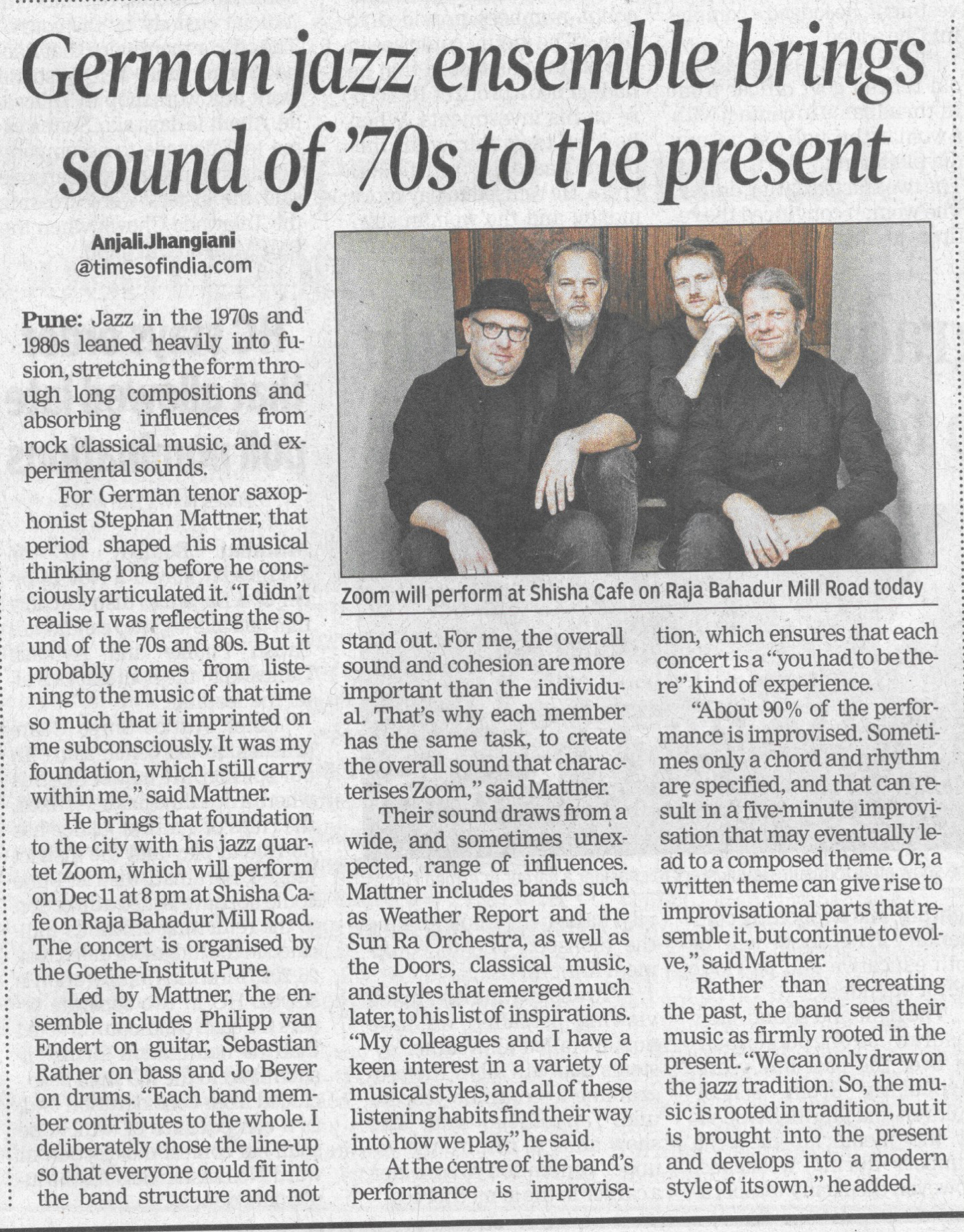 “ … Kurz: man muss es machen wie das Quartett Zoom, … in dem sich Mattner und der Gitarrist van Endert melodische Bälle zuwerfen und sich gemeinsam mit dem Bassisten Räther und Beyer am Schlagzeug dafür ins Zeug legen, dass die Musik noch in ihren ruhigsten Momenten nicht ihre rasante Spannung und ihren Drive verliert. … „